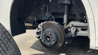 大体の車両はレールのようなところに切り欠きがあってそこに、ジャッキをかけます。一部の海外製の車両やラダーフレームの車両は別の場所にジャッキをかけるところがあるので、よく探してみてください