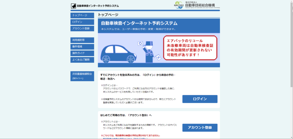 - 独立行政法人自動車技術総合機構のホームページよりアカウントを登録し車検を受ける日を予約する。