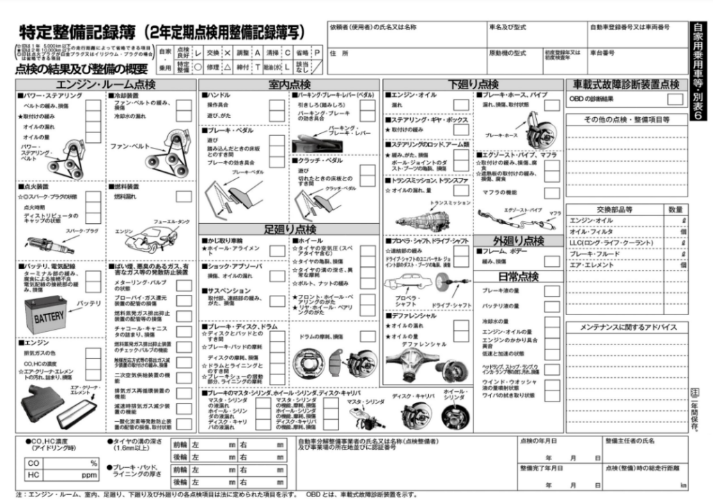 はじめに、車検を受けるっ前に車両の点検をしておくことをお勧めします。車検を受けて検査に引っかかると指摘箇所の修理と再検査が必要で、時間とコストが余計にかかってしまいます。定期点検記録簿を基に点検整備をしておくことをお勧めします。いろいろなものがあるので、下記のリンクより好きなものをダウンロードして使ってください