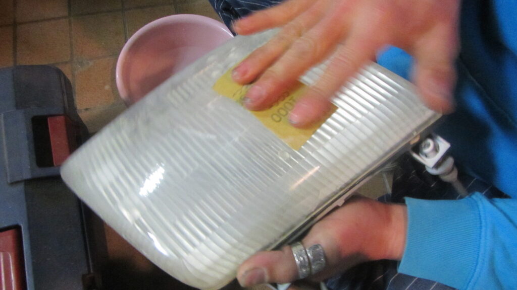 どれくらい磨くの?と思うかもしれませんが、#1000で黄ばみが取れるまで、相手がポリカーボネートなのでミルミルとれていきます