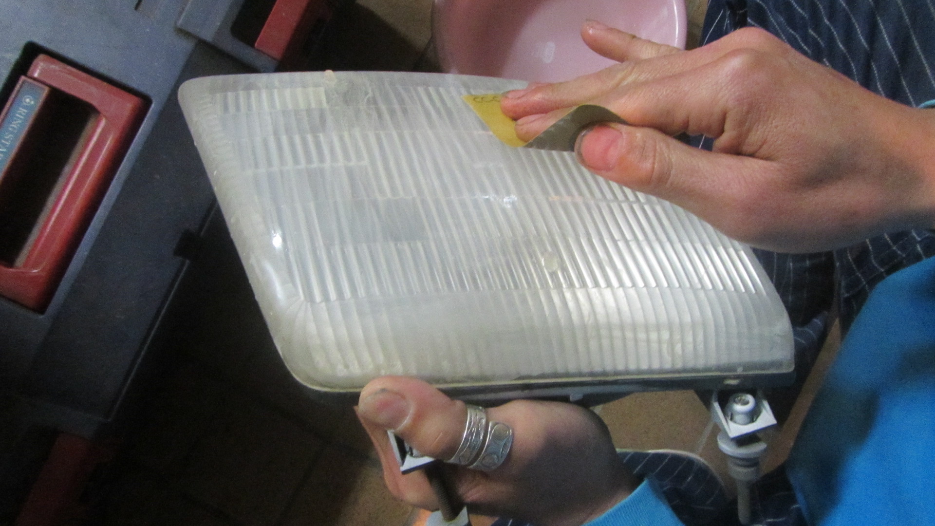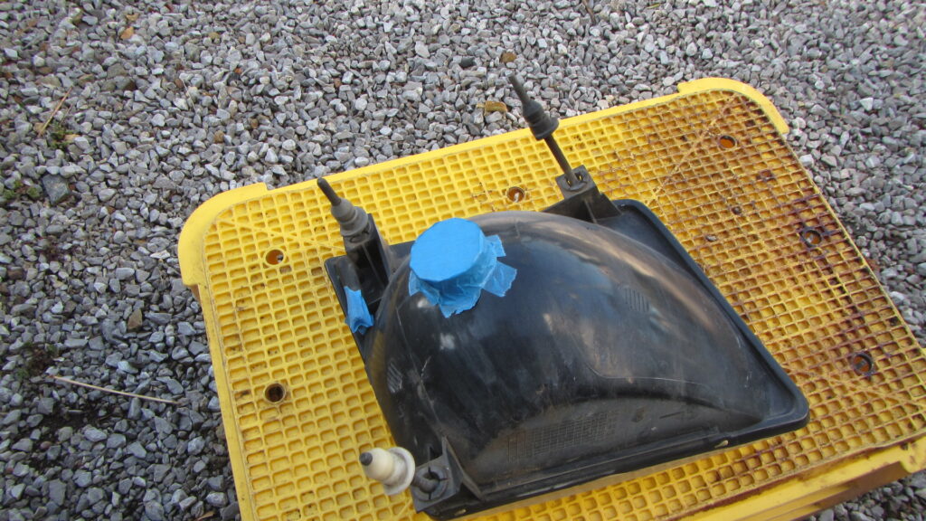 レンズ部分を磨いていくのですが、その時に削りかす混じりの水がヘッドライト内部に入るのを防ぐため