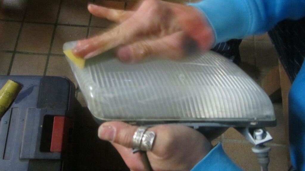 水をつけてヘッドライトのレンズ面を磨いていきます