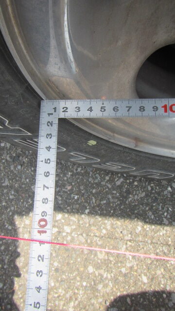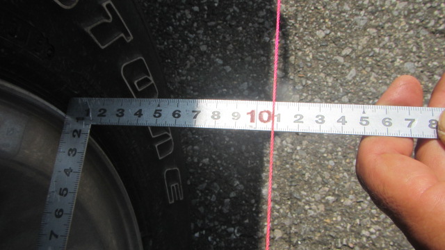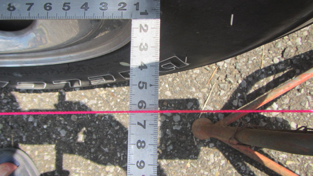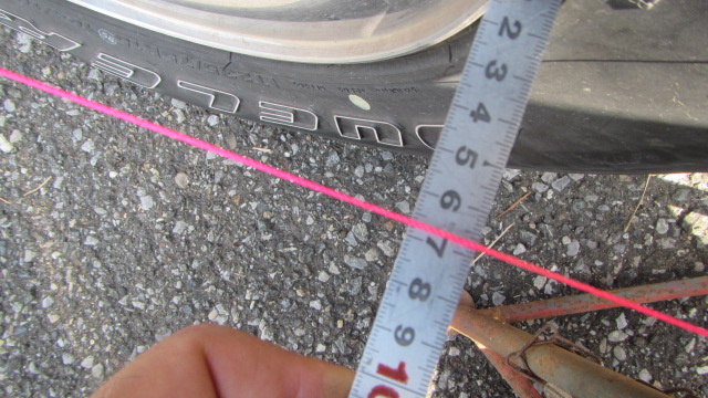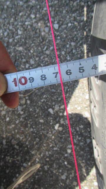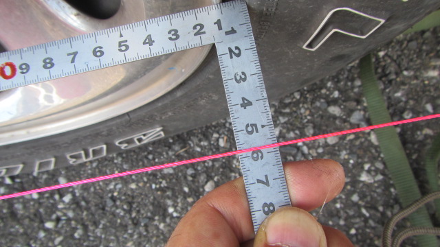 • 前輪のホイルの後ろの部分、前の部分で水糸との距離を測ります。