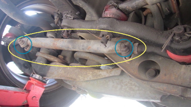 • 車両の下に潜り、タイロッド(黄色い部分)を回してタイヤの向きを調節します。