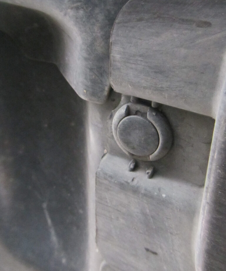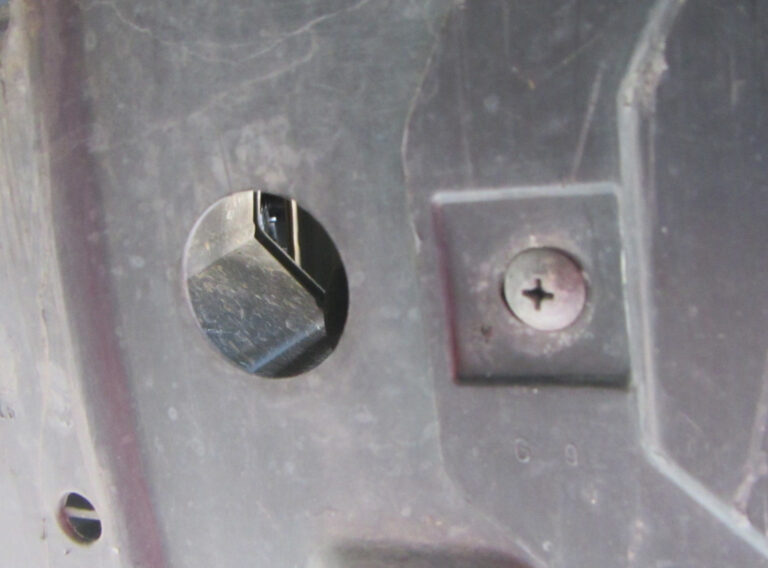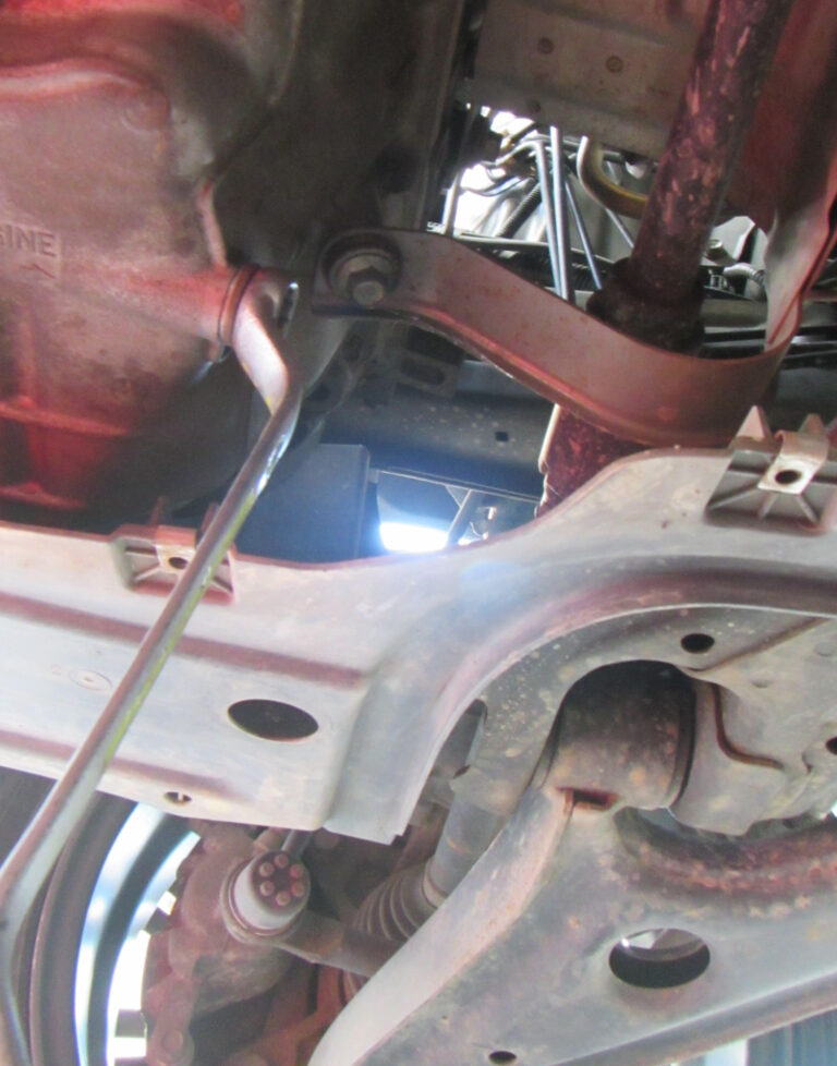 写真二枚目、車体下から覗くと運転手側エンジン後方にドレンプラグがあるので、17mmのレンチで緩めます。