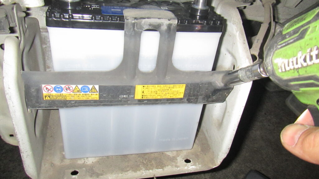 - バッテリーを固定している金具10mmのナットを緩めて外します