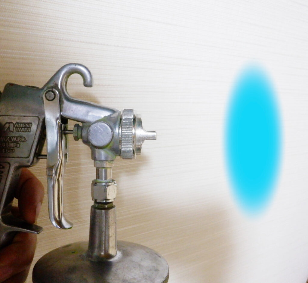 - スプレーする面から、15~20センチ離してガンをもって、表面に対してできる限り垂直に持ちます、傾いていると均一に塗布できません。
