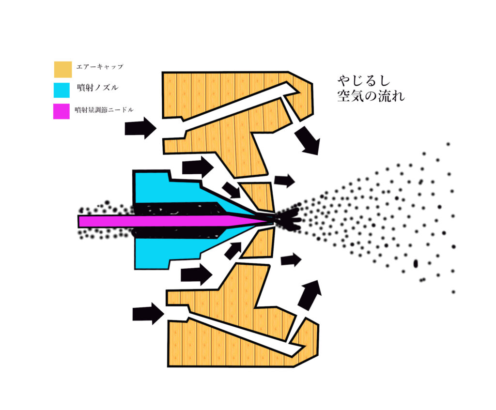 - 左のイラストのエアーキャップの角のようなところから、内側に向いて出ている空気で散布された塗料の広がりを押しつぶして楕円形の形で塗料が噴出されます