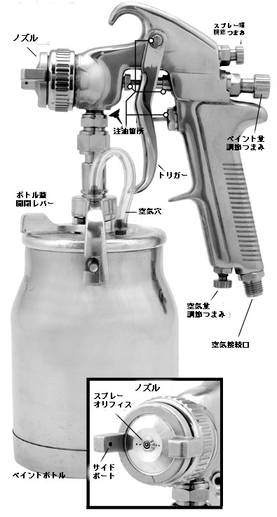周りの穴から空気が勢いよく出て負圧になりボトル内の塗料がここから吹き出ます - サイドポート