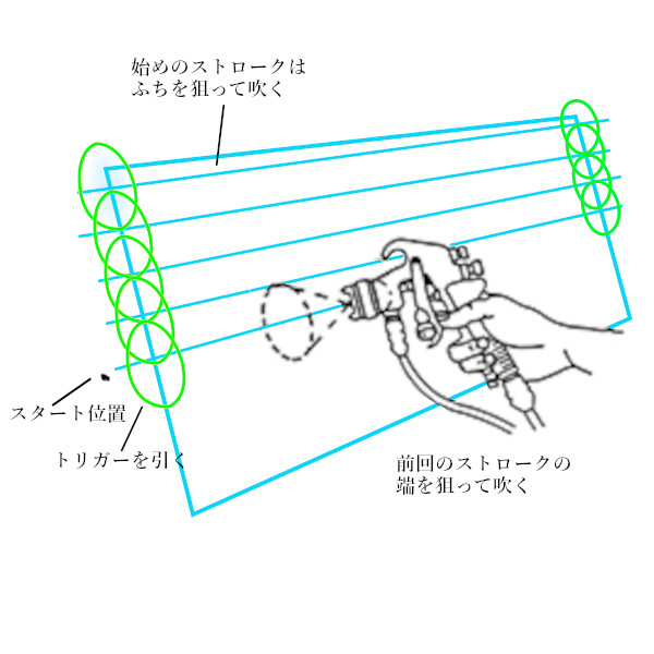 - 図のような面にスプレーするときは、縦長の楕円にして上から下に列を作るようにスプレーしていきます。初めのストロークははみ出し気味になってしまいますが、これで端っこもほかの部分と同じような塗布量になります。