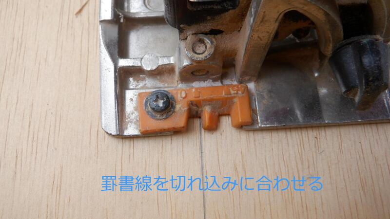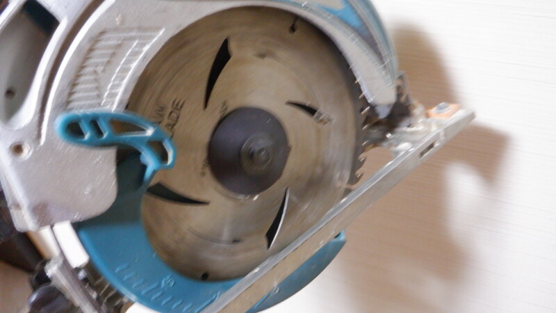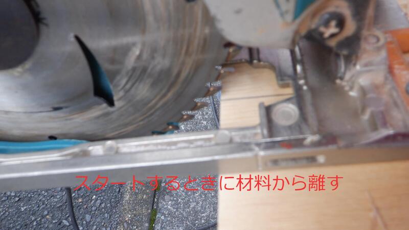 その時に刃が材料に触れないようにします。 - トリガーを引き刃が回転しだし、適切な回転速度になったら丸鋸を材料に押し込んでいきます。