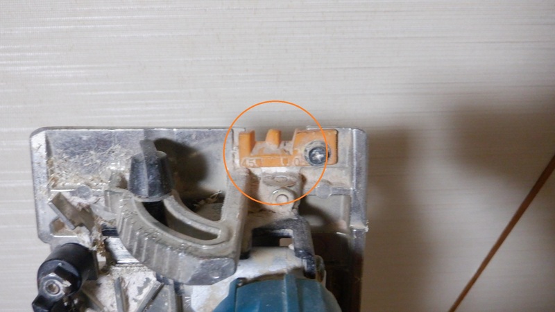 素材に対しての丸鋸の歯の角度を調節できます。斜めに切りたい時などに使います。 - 深さ調節レバー