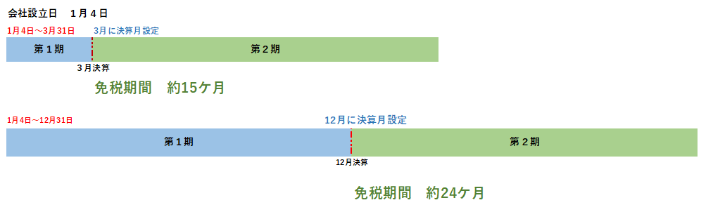 設立日の決め方とで重複しますが、免税期間は「2年間」ではなく「2期の間」なのでなるべく長いこと1期目を使ったほうが、メリットを長く生かせます。