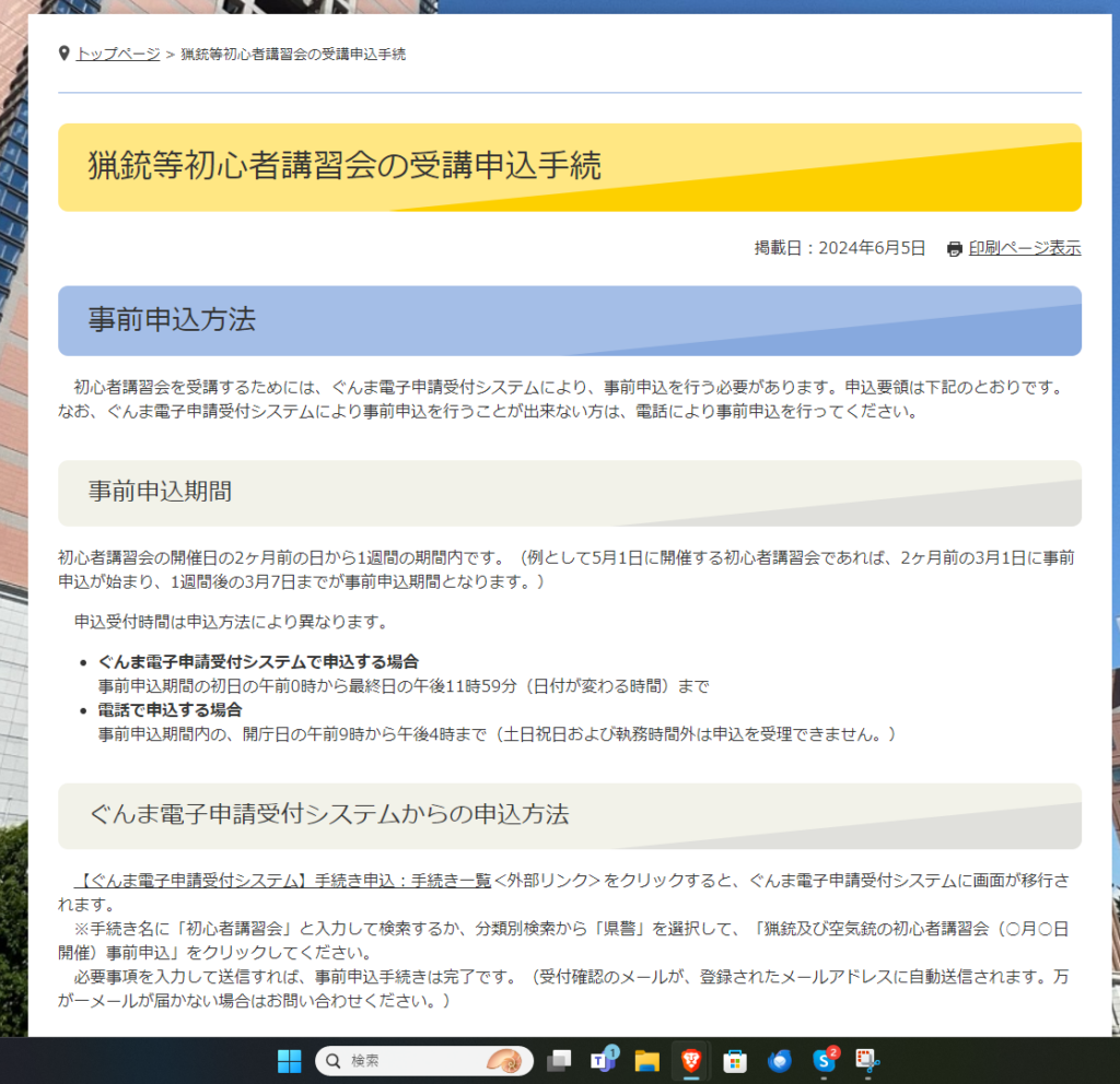 群馬県に住んでいるので、群馬県のホームぺージより、猟銃等取扱に関する初心者講習会の事前申し込みに申し込みをします。
