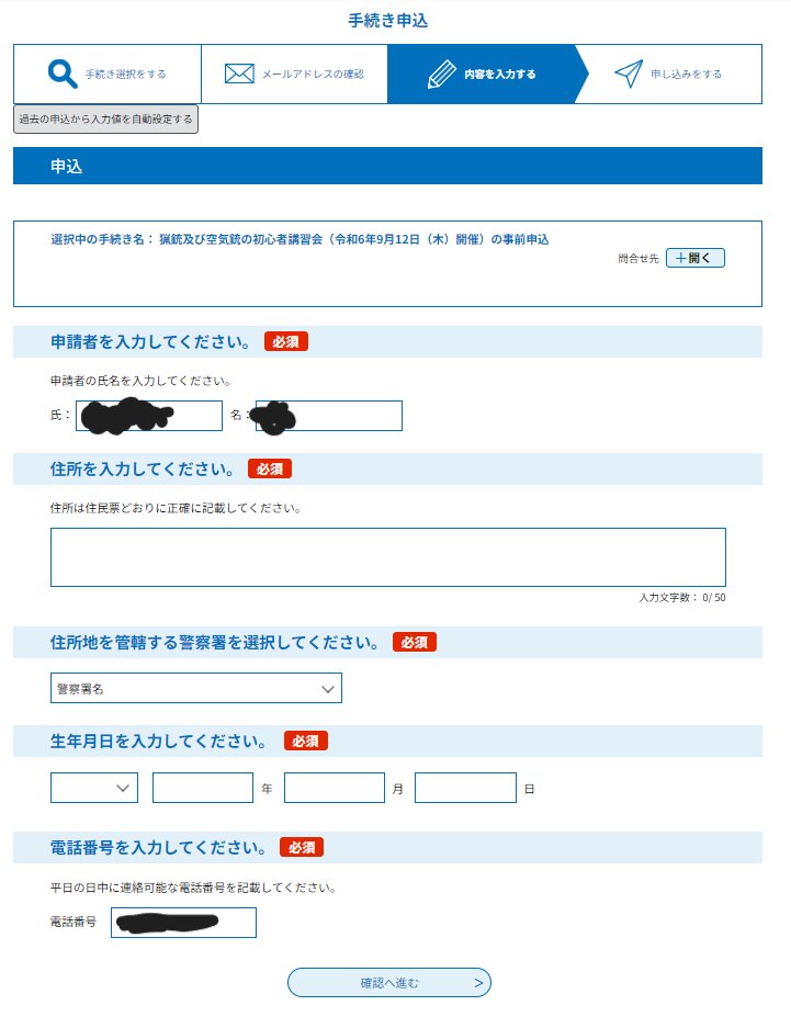 - 県のサイトにアクセスして必要項目を入力して、確認画面に進むボタンを押す