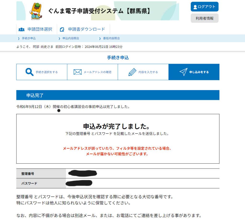 画像4 進めていくと申し込みが完了ということになり、入力したメールアドレスに完了したという知らせと、整理番号、パスワードが届きます。